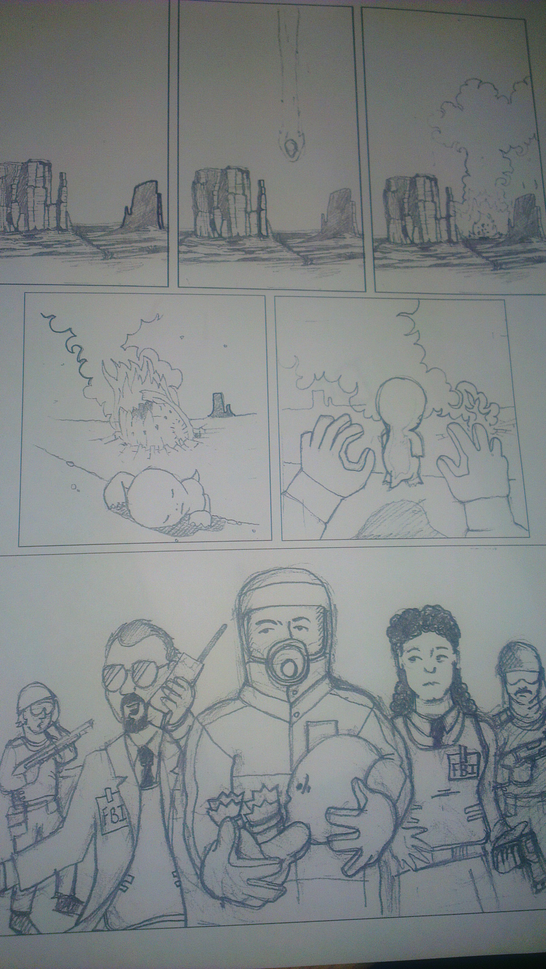As you can see, the images and arrangement have evolved somewhat from my crude sketches to Mat’s rather more elegant pencils. Working out how to make a coherent narrative as well as a visually interesting sequence is an interesting challenge and I’m enjoying seeing how our story changes as it gets more ‘real’. Obviously we’ve still got inking and lettering to go (we’re going black and white… for now) so expect updates as to how that goes in the not too distant future!