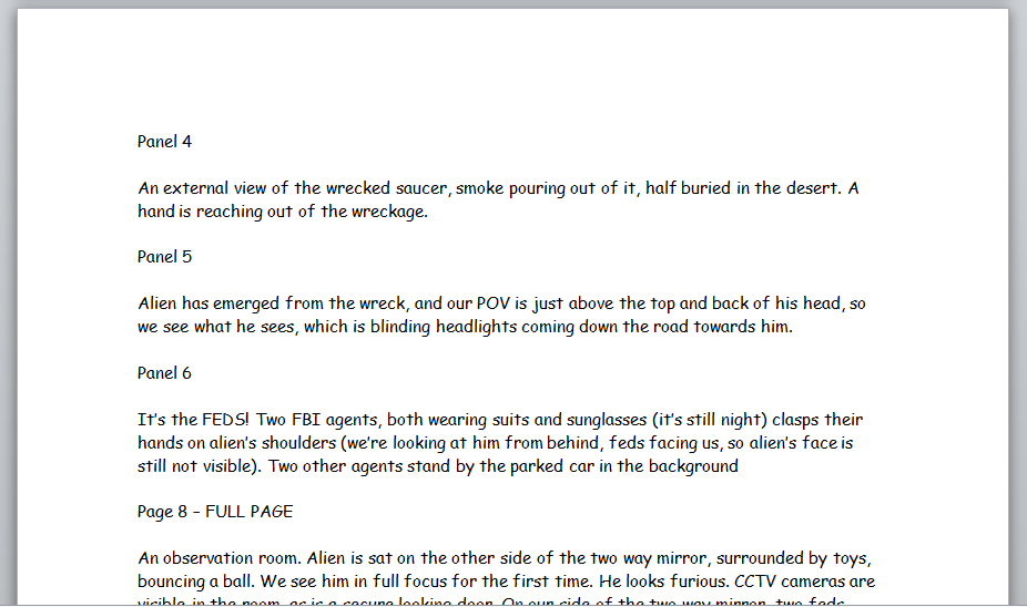 3. Once an issue was sketched out, I started writing a script, much like a screenplay, but with a lot of extra stage direction to give Mat an idea of what to draw and what would be in each panel described.