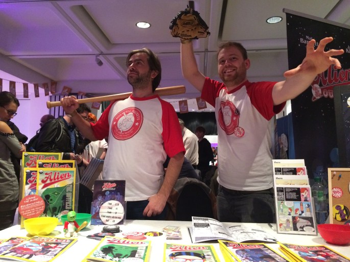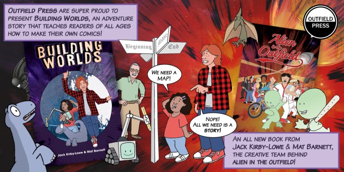 Hi everyone! Glad you could join us! We’re Jack Kirby-Lowe and Mat Barnett, creators of all ages books ALIEN IN THE OUTFIELD and BUILDING WORLDS. You can find out more about our books by clicking the links below or download a FREE PREVIEW COMIC by following this link. Both are available in print (or digital) and, if you click through from this page, you can order at our special Thought Bubble discount prices! We’ll be livestreaming and releasing more treats and surprises during the day too, so please be sure to follow us on Twitter or Instagram or check in with us again later!